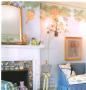This bedroom - decorated for the 2007 Stately Homes By-The-Sea showhouse in Rumson-has a youthful quality without defining age. Carol Canner's mirror "Mittens & Morgan" is featured above a fireplace with animal-themed tiles original to the estate.