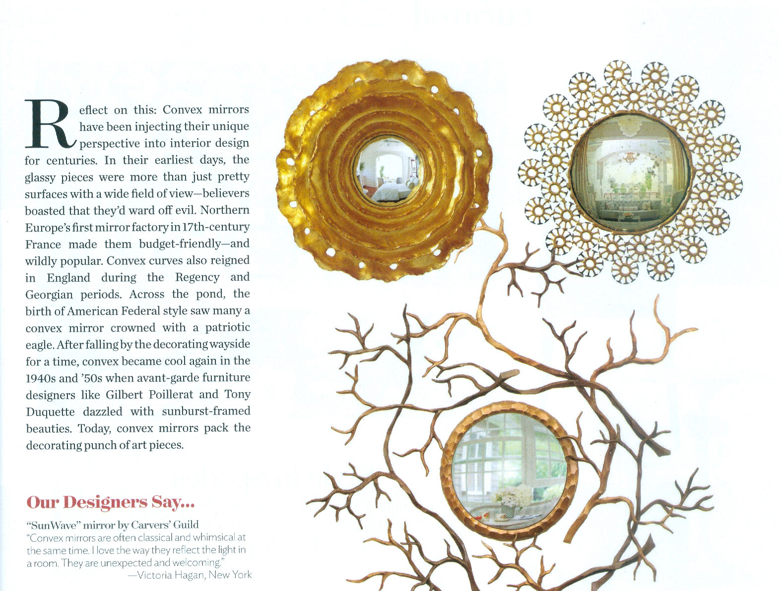 SunWave mirrors by Carver' Guild. "Convex mirrors are often classical and whimsical at the same time. I love the way they reflect the light in a room. They are unexpected and welcoming" Victoria Hagen, New York