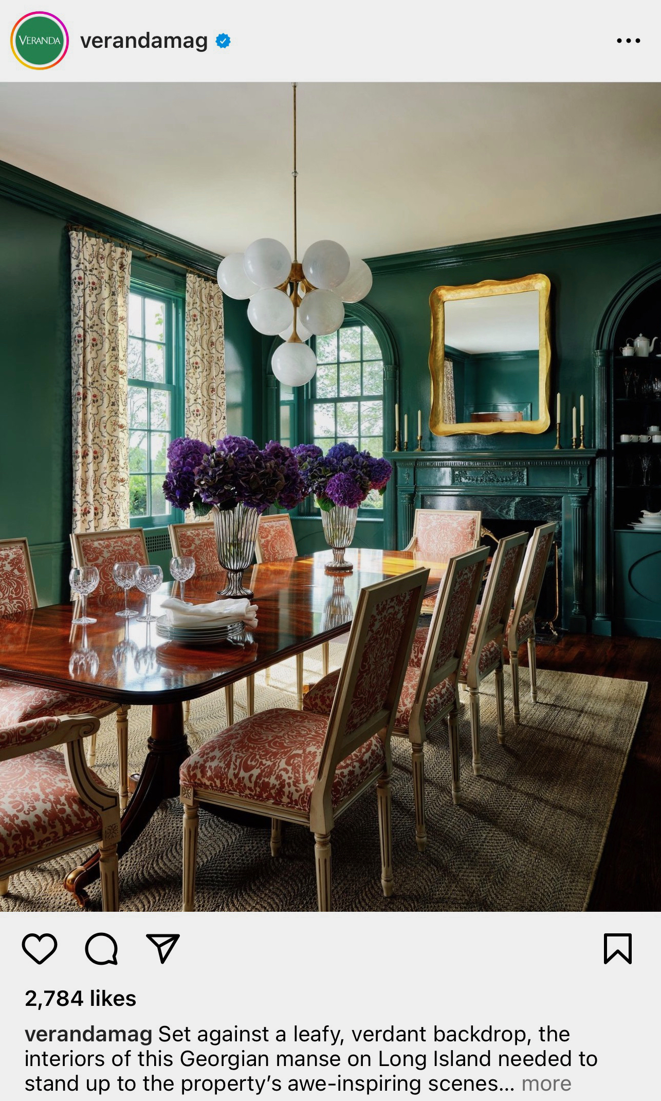 Carol Canner's original design, the gorgeous #2022 Tempo Mirror in Gold Leaf enlivens a LI dining room. "Set against a leafy, verdant backdrop, the interiors of this Georgian manse on Long Island needed to stand up to the property’s awe-inspiring scenes. Designer Emily Sturgess (@emilymsturgess) relied on fabrics whose patterns and colors played to the environment outside the front door. The funky chandelier (@visualcomfort) and curvaceous mirror (@carversguildmirrors) bring some youthfulness and modernity to this jade-green dining room. An exclusive look at this refreshing retreat on Long Island. — Photography by Read McKendree (@readmckendree) Styled by Matthew Gleason (@matthewgleasonstylist)" - Veranda Magazine