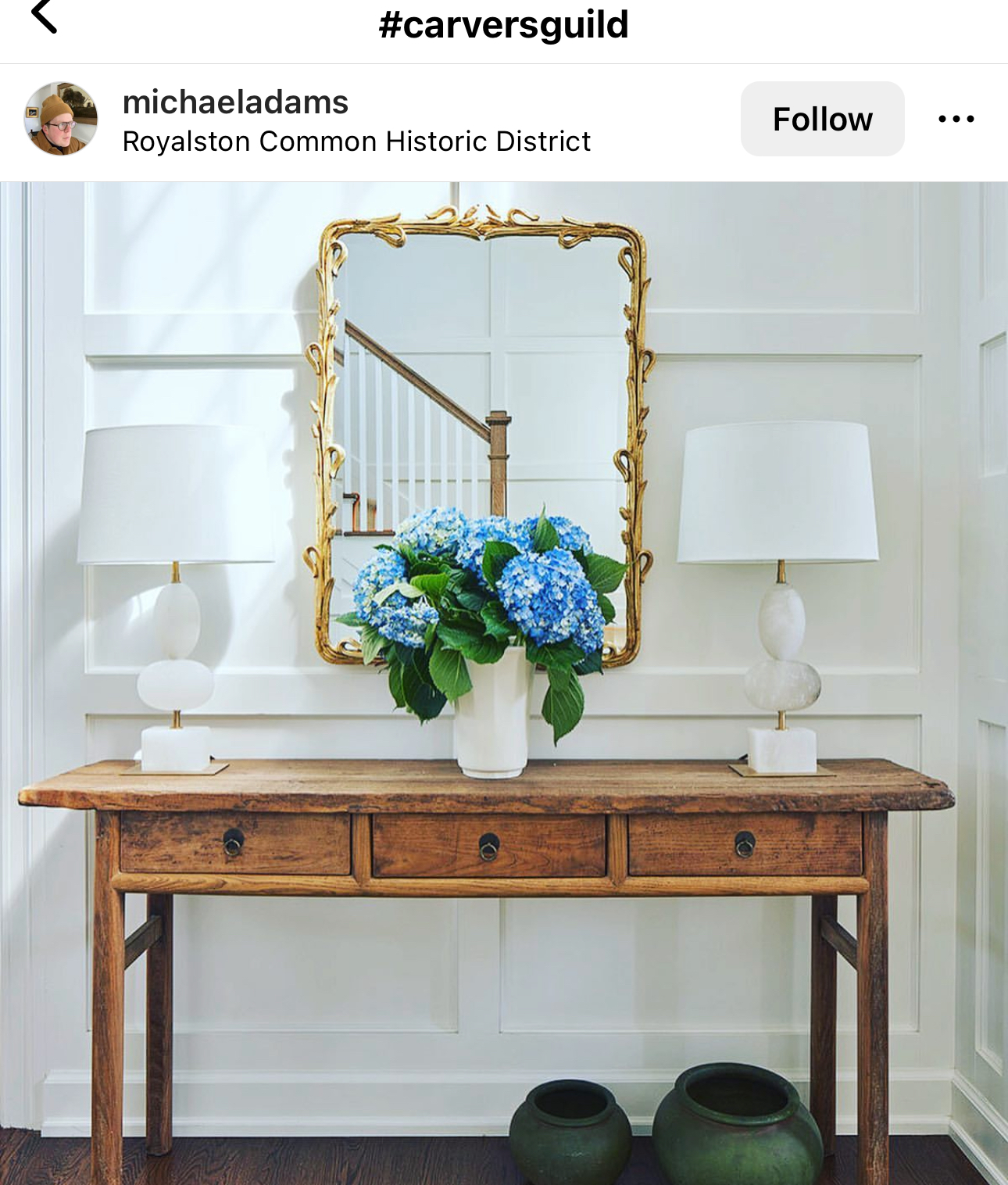 Our #5228 Cat-O-Nine-Tails Mirror makes a gracious welcome in this grand Southhampton foyer, interior designed by Michael Adams in the Royalston Commons Historic District. Recently completed foyer in Southampton. I love so many things in this space from the @carversguildmirrors mirror called “Cat-O-Nine-Tails” that I know is reference to the plant that grows near wetlands but to me looks like actual cat tails. The @lamaisonpierrefrey embroidered bench fabric the #fornasetti dog umbrella stand from @cupiogallery and the alabaster lamps from @circalighting oh! And that Chinese antique elm console is pretty perfect too! - @michealadams